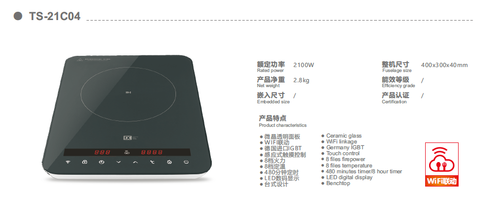 Aparelho elétrico doméstico, sempre trazemos uma maneira de cozinhar feliz.Fogão de indução simples de mesa TS-21C04, este é um fogão inteligente.é o nosso novo design que pode se conectar com WIFI, fazer você se divertir mais.A temperatura, o temporizador e a energia são todos sensíveis ao toque.O fogão inteligente usa uma única zona de cozimento, tornando-o perfeito para todos os métodos de cozimento.Apenas relaxe e aproveite.Criamos a programação interna por conta própria.Os benefícios de um fogão de indução incluem economia de energia, proteção ambiental, segurança, ausência de chamas, melhorias na saúde do chef, tempos de aquecimento mais rápidos e cozimento rápido.Todos os tipos de cozinhas, incluindo residências, estabelecimentos de panelas quentes, hotéis e shopping centers, bem como situações em que não haja abastecimento de combustível ou restrição ao uso de combustível para fogueiras, podem se beneficiar do uso de fogões eletromagnéticos .os principais produtos da empresa, um fogão inteligente.