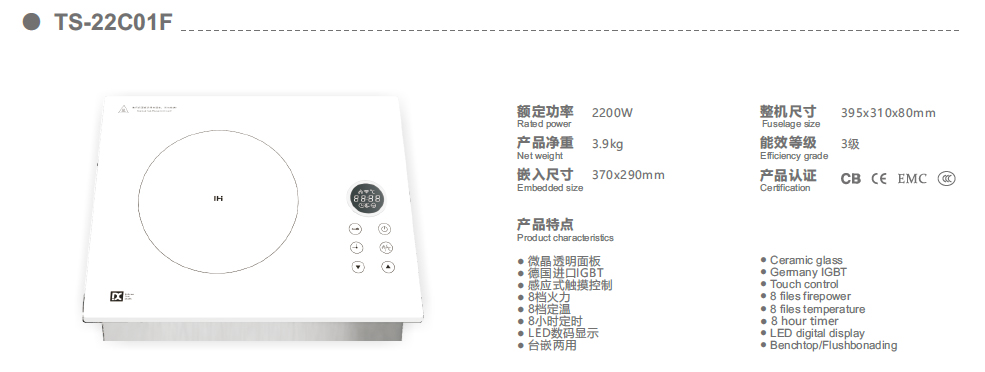 TS-22C01F table top single induction cooker, this is a smart cooker, it can be both table standing use and also be build-in as a nice looking. it is our new design which using the knob for control the up and down power, timer, and temperature. The glass of this model use from the NEG glass which import from Japan, it is the top brand name of glass.